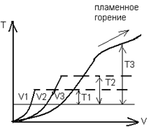 Здесь приведен график зависимости тем-ры самовозгорания от объема горючей смеси. В органических соединениях при повышении тем-ры реакция окисления идет быстрее (с выделением теплв). V1 – тем-ра поднимается до определенного значения и далее изменяться не будет. ΔТ1 – прирост тем-ры за счет окисления.