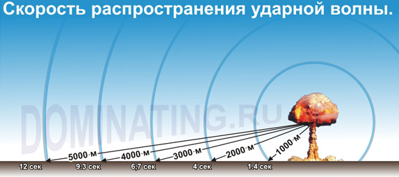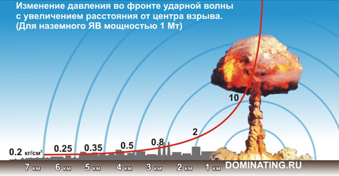 Так, при взрыве 20-килотонного ядерного боеприпаса ударная волна за 2 секунды проходит 1000 м, за 5 секунд – 2000 м, за 8 сек – 3000 м. Передняя граница волны называется фронтом ударной волны. Степень поражения УВ зависит от мощности и положения на ней объектов. Поражающее действие УВ характеризуется величиной избыточного давления.