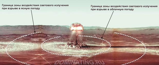 Световое излучение (СИ) – это поток лучистой энергии (ультрафиолетовые и инфракрасные лучи). Источником СИ является светящаяся область взрыва, состоящая из нагретых до высокой температуры паров и воздуха. СИ распространяется практически мгновенно и длится в зависимости от мощности ядерного боеприпаса (20-40 секунд). Однако не смотря на кратковременность своего воздействия эффективность действия СИ очень высока. СИ составляет 35% от всей мощности ядерного взрыва. Энергия светового излучения поглощается поверхностями освещаемых тел, которые при этом нагреваются. Температура нагрева может быть такой, что поверхность объекта обуглится, оплавится, воспламенится или объект испарится. Яркость светового излучения намного сильнее солнечного, а образовавшийся огненный шар при ядерном взрыве виден на сотни километров. Так, когда 1 августа 1958 г. американцы взорвали над островом Джонстон мегатонный ядерный заряд, огненный шар поднялся на высоту 145 км и был виден с расстояния 1160 км. Поражающее действие светового излучения характеризуется световым импульсом, т. е. количеством световой энергии, приходящейся за время излучения на 1 см2 поверхности, перпендикулярно расположенной к направлению световых лучей. За единицу измерения светового импульса принимают 1 кал/см2.