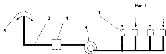 Вытяжная местная вентиляция состоит (см. рис. 1) из вытяжных отверстий или насадков - 1, через которые воздух удаляется из помещения; вентилятора - 3, воздуховодов - 2; устройства для очистки воздуха от пыли или газов - 4, устанавливаемого в тех случаях, когда выбрасываемый воздух необходимо очищать с целью обеспечения нормативных концентраций вредных веществ в выбрасываемом воздухе и воздухе населенных мест, а также в приточном воздухе, подаваемом в производственные здания; устройства для выброса воздуха - 5, которое должно быть расположено на 1-1,5 м выше конька крыши.