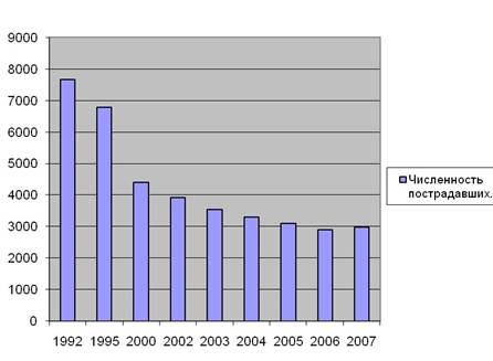 В Российской Федерации в течение последних пяти лет наблюдается тенденция к некоторому снижению аварийных ситуации на промышленных объектах. Однако при этом увеличиваются масштабы их последствий и ущербы от них. В настоящее время официальная статистика численности пострадавших на производстве указывает на тенденцию снижения количества травм и гибели работников предприятий. (табл.2). [5].