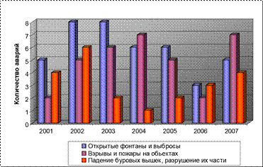 Наибольшее количество аварий на нефтяных и газовых скважинах вызванными открытыми фонтанами и выбросами зарегистрировано 2002-03 гг. На представленной диаграмме хорошо видно количество взрывов и пожаров за период 2001-04 гг. увеличилось и резко сократилось к 2006 г., но возросло (3,5 раза) в 2007 г. Максимально падение буровых вышек отмечается в 2002 г. До 2005 г. наблюдалось тенденция снижения падения буровых вышек, а за последние два года увеличение. Ежегодное увеличение количества падение буровых вышек, разрушение их части связанно с большим сроком эксплуатации и износом технологического оборудования [8].