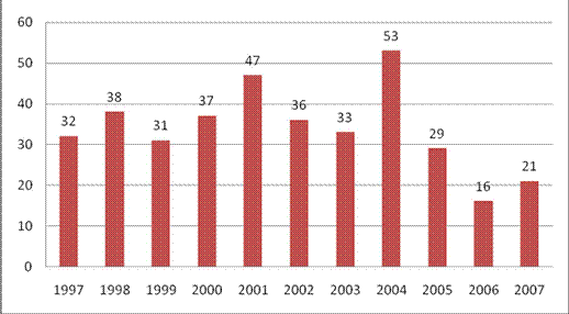 Рис. 7 Динамика травматизма со сметрельным исходом за 1999-2007 гг.