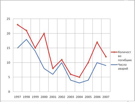 На диаграмме наблюдается снижение числа аварий до 2004 г., которое характеризовало положительную динамику и улучшение безопасности. В 2000 г. прослеживается малое количество аварий, но вызвавшие большое количество погибших. Это указывает на массовую гибель персонала на одном предприятии.