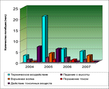 На основе построенной диаграммы мы можем утверждать о снижений числа погибших в результате термического воздействия 2007 по сравнению с 2005 годом приблизительно в 5 раз. Результатом таких изменений могут быть более жесткий контроль над объектами химической, нефтехимической, нефтегазоперерабатывающей промышленности.