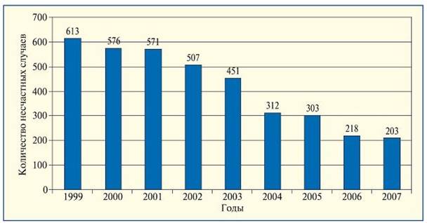 Динамика травматизма со смертельным исходом показывает тенденцию к снижению числа травм за последние 9 лет. Так по сравнению с 1999 гг. число несчастных случаев со смертельным исходом в 2007 г. сократилось в 3 раза.