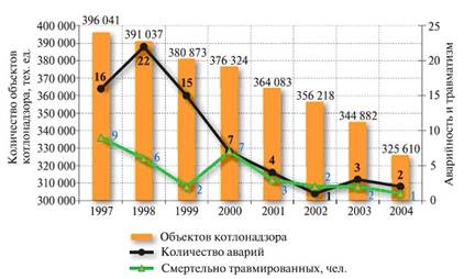 Количество контролируемых Ростехнадзором оборудования работающих под давлением с 1997 по 2004 гг. сократилось в 12 раз, что и в свою очередь привело к снижений количества аварий со смертельным исходом. Если в 1997 г. на 396 041 тех. ед. приходилось 16 аварий с 9 летальными исходами, то 2004 на 325 610 тех. ед. приходилось только 2 аварии с 1 летальным исходом, что указывает снижение аварийности за 8 лет в 6 раз, а смертности в 7 раз.