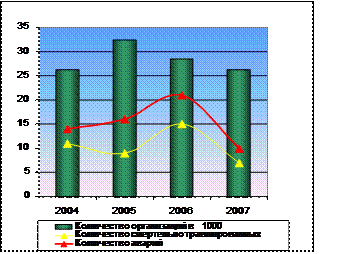 Таблица 4 Динамика объемов производства, травматизма со смертельным исходом и аварийности в нефтеперерабатывающей промышленности за 1997-2007 годы