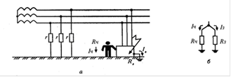 Рис 3.4.6 Защитное заземленне: а – схема заземления корпуса электрооборудования; б-эквивалентная электрическая схема