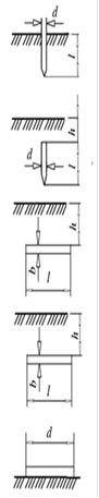 Труба, стержень у поверхности земли Труба, стержень на глубине h'; h= h'+1/2 Протяженный за-землитель (полоса, труба) на глубине А, ширина b Кольцевой зазем-литель (полоса, труба) на глубине h Круглая пластина на поверхности земли (диаметр d) |