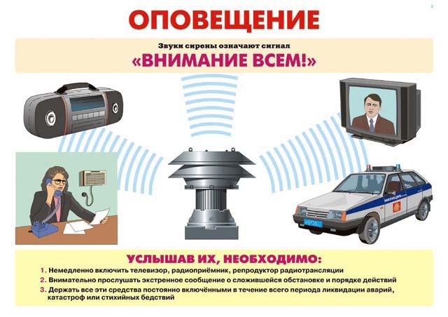 | Среди защитных мероприятий гражданской обороны, осуществляемых заблаговременно, особо важное место занимает организация оповещения органов гражданской обороны, формирований и населения об угрозе нападения противника и о применении им ядерного, химического, бактериологического (биологического) оружия и других современных средств нападения. Особое значение оповещение приобретает в случае внезапного нападения противника, когда реальное время для предупреждения населения будет крайне ограниченным и исчисляться минутами. По данным зарубежной печати, считается, что своевременное оповещение населения и возможность укрытия его за 10-15 мин после оповещения позволит снизить потери людей при внезапном применении противником оружия массового поражения с 85 % до 4-7 %. Поэтому защита населения от оружия массового поражения даже при наличии достаточного количества убежищ и укрытий будет зависеть от хорошо организованной системы оповещения, организация которой возлагается на штабы гражданской обороны. Современные системы дальнего обнаружения позволяют быстро определить не только место и направление движения носителя, но и время его подлета. Это обеспечивает передачу сигнала по системе оповещения до штабов гражданской обороны и объектов. Оповещение организуется для своевременного доведения до органов гражданской обороны, формирований и населения сигналов, распоряжений и информаций гражданской обороны о эвакуации, воздушном нападении противника, радиационной опасности, химическом и бактериологическом (биологическом) заражении, угрозе затопления, начале рассредоточения и др. Эти сигналы и распоряжения доводятся до штабов гражданской обороны объектов централизованно. Сроки доведения их имеют первостепенное значение. Сокращение сроков оповещения достигается внеочередным использованием всех видов связи, телевидения и радиовещания, применением специальной аппаратуры и средств для подачи звуковых и световых сигналов. Все сигналы передаются по каналам связи и радиотрансляционным сетям, а также через местные радиовещательные станции. Одновременно передаются указания о порядке действий населения и формирований, указываются ориентировочное время начала выпадения радиоактивных осадков, время подхода зараженного воздуха и время подхода зараженного воздуха и вид отравляющих веществ. Сигналы, поданные вышестоящим штабом, дублируются всеми подчиненными штабами. С целью своевременного предупреждения населения городов и сельских населенных пунктов о возникновении непосредственной опасности применения противником ядерного, химического, бактериологического (биологического) или другого оружия и необходимости применения мер защиты установлены следующие сигналы оповещения гражданской обороны: «Воздушная тревога»; «Отбой воздушной тревоги»; «Радиационная опасность»; «Химическая тревога». В штабах гражданской обороны городов могут устанавливаться разнообразная сигнальная аппаратура и средства связи, которые позволяют с помощью пульта включать громкоговорящую связь и квартирную радиотрансляционную сеть, осуществлять одновременный вызов руководящего состава города и объектов народного хозяйства по циркулярной телефонной сети, принимать, распоряжения вышестоящих штабов и передавать свои распоряжения и 