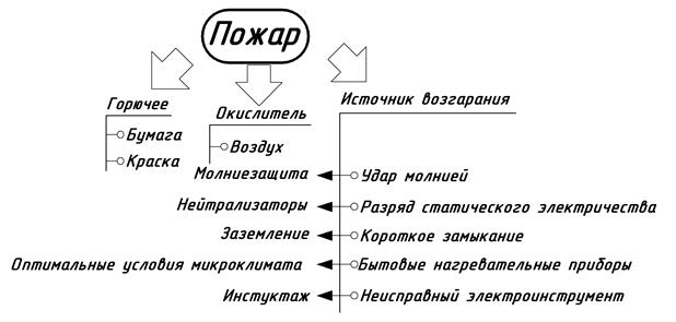 Пожар возможен при наличие трех условий: 1 горючее, 2 окислитель, 3 источник возгорания. Горючими материалами могут быть: бумага, некоторые виды красок см. рис. 1.26. Источником возгорания при работе машины может быть удар молнией, разряд статического электричества, короткое замыкание, использование бытовых нагревательных приборов, неисправный электроинструмент. Для каждого вида источника возгорания предусмотрены свои методы защиты. В соответствии с ФЗ №68 о защите населения от терристических акций в условиях ЧС с персоналом проводится обучение действия в условиях возникновения ЧС.