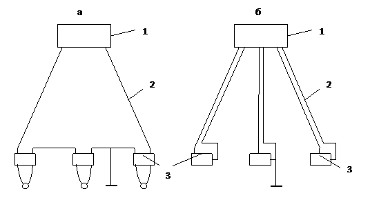 а — шлейфная; б — лучевая (1 — приемная станция; 2 — линия связи; 3 — извещатели (датчики))