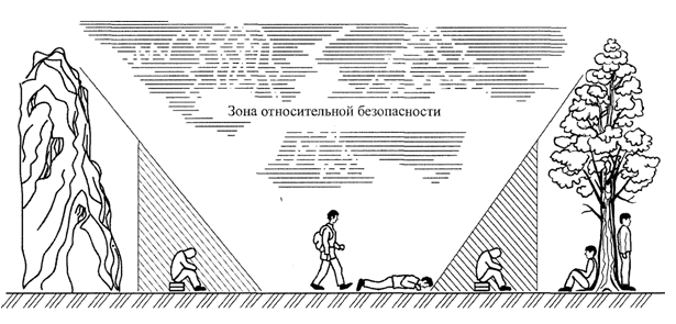 Рис. 23. Зона безопасности во время грозы (показана штриховкой)