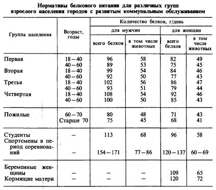 В табл. 4 приведены нормы белкового питания для различных групп взрослого населения, живущего в городах с развитым коммунальным обслуживанием. Кроме того, в новых рекомендациях указывается также дополнительная потребность в белках, связанная с активными формами отдыха и с проживанием в населенных пунктах с менее удовлетворительными бытовыми условиями. Удельный же их вес в общей калорийности питания колеблется от 12% (четвертая группа) до 14°о (первая группа). При этом доля животных белков составляет для лиц, занимающихся напряженной умственной деятельностью, 60%, а для работников физического труда – 50%.