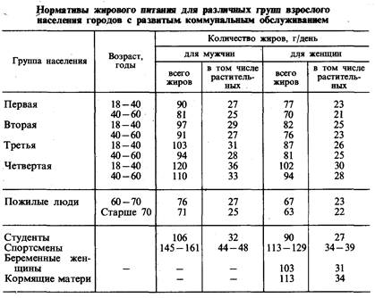 Следовательно, предметом дискуссии может быть лишь желательная норма жиров в питании различных групп населения. Согласно существующим рекомендациям, она в среднем должна равняться 30% от общей калорийности, причем 70% этого количества должно приходиться на долю животных жиров (табл. 7).