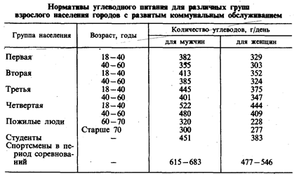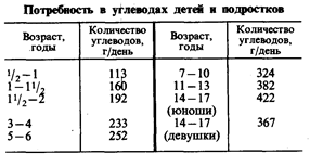 Потребность в углеводах в первую очередь определяется величиной энергетических затрат, причем в современных условиях соответствующие нормативы для лиц, не занимающихся физическим трудом, должны быть значительно снижены, особенно в зрелом и пожилом возрасте (табл. 9). Что касается норм углеводного питания для детей и подростков, то при их установлении опять-таки необходимо исходить из возрастных особенностей организма, определяющих его энергетические потребности (табл. 10).