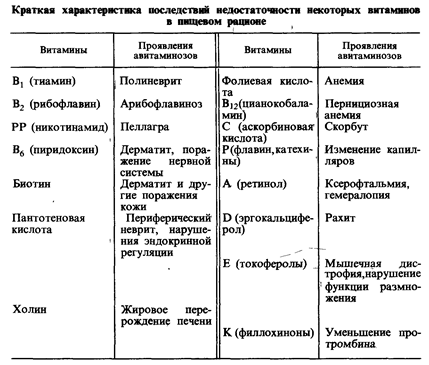 Если в течение более или менее продолжительного времени количество витаминов в пищевом рационе является недостаточным, то развивается своеобразное патологическое состояние. Обычно это состояние, именуемое гиповитаминозом, проявляется резким падением сопротивляемости организма к инфекционному началу, выраженным снижением работоспособности, ослаблением памяти и т. д. Ранняя диагностика гиповитаминозов бывает довольно затруднительной ввиду неспецифичной симптоматики, но облегчается проведением соответствующих лабораторных исследований. Так, например, C-гиповитаминоз может быть установлен по снижению концентрации аскорбиновой кислоты в крови и уменьшению выведения ее с мочой.