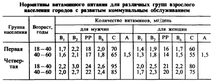 Принятые в настоящее время нормативы витаминного питания населения в значительной мере удовлетворяют указанным требованиям (табл. 14 и 15).