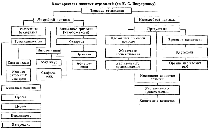 Для систематизации пищевых отравлений был разработан ряд классификационных аем, из которых наиболее обоснованной и полной является классификация, предложенная К. С. Петровским, (согласно которой все рассматриваемые патологические состояния разделяются на три основные группы, а именно на пищевые отравления микробной и немикробной природы и неустановленной этиологии. В свою очередь первые включают в себя токсикоинфекции, интоксикации и микотоксикозы, а вторая – острые и хронические немикробные отравления.