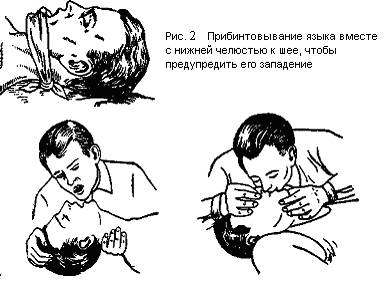 "Если язык все же западает, его прошивают или прокалывают английской булавкой и фиксируют к воротнику одежды. С этой же целью можно также прибинтовать язык вместе с нижней челюстью к шее (рис. 2).