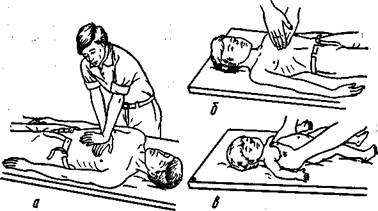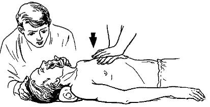 При внезапном прекращении сердечной деятельности, признаками которого является отсутствие пульса, сердцебиений, реакции зрачков на свет (зрачки расширены), немедленно приступают к непрямому массажу сердца: пострадавшего укладывают на спину, он должен лежать на твердой, жесткой поверхности. Встают с левой стороны от него и кладут свои ладони одну на другую на область нижней трети грудины. Энергичными ритмичными толчками 50—60 раз в минуту нажимают на грудину, после каждого толчка отпуская руки, чтобы дать возможность расправиться грудной клетке. Передняя стенка грудной клетки должна смещаться на глубину не менее 3—4 см.