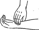 Техника. Непрямой массаж сердца, проводимый одним человеком. Пострадавшего укладывают на спину, запрокидывают ему голову. Платком или марлей очищают полость рта, делают 3 —5 дыханий методом рот в рот, рот в нос. Располагаются слева от больного или опускаются на колени, если он лежит на полу (на земле). На нижнюю треть грудины кладут ладонь левой руки, а сверху нее — ладонь правой руки. Надавливают на грудину достаточно сильно, чтобы она опустилась приблизительно на 5 см, за тем задерживают на мгновение в этом положении и быстро отпускают. Цикл надавливание-—отпускание должен составлять несколько меньше секунды. Через каждые 15 циклов делают 2 частых дыхания методом рот в рот или рот в нос. Признаком эффекта массажа является сужение ранее расширенных зрачков, появление фибрилляции желудочков, а затем и редких сердечных сокращений, восстановление спонтанного дыхания. Массаж продолжают до полного восстановления сердечной деятельности, появления отчетливых сердцебиений и пульса на периферических артериях.