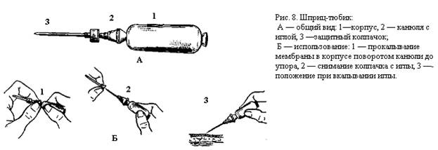 Шприц-тюбик (рис. 8) состоит из полиэтиленового корпуса, инъекционной иглы и защитного колпачка; предназначен для одноразового введения лекарств внутримышечно или подкожно.