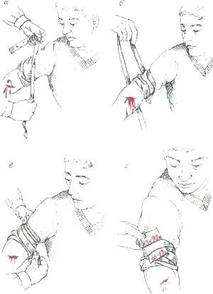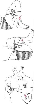 Временная остановка кровотечения может быть достигнута сгибанием конечности. На рис. 10 показана техника остановки кровотечения при ранениях верхней и нижней конечностей.