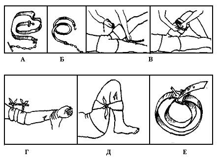 а — ленточный кровоостанавливающий жгут; б—круглый кровоостанавливающий жгут; в —наложение кровоостанавливающего жгута; г — наложение закрутки; д — максимальное сгибание конечности; е — двойная петля брючного ремня.
