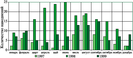 Рис. 1. Количество наводнений в 1997-1999 гг. по месяцам.