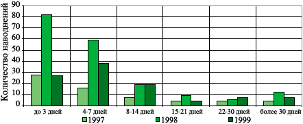 Рис. 2. Распределение наводнений в 1997-1999 гг. по их продолжительности в днях.