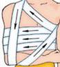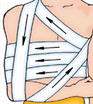 3. наложить герметизирующую (окклюзионную) повязку Герметизирующую повязку накладывают для того, чтобы предотвратить дальнейшее попадание воздуха в плевральную полость. Перед наложением повязки края раны смазывают любым жиром (вазелин, крем, растительный жир и т.п.), желательно стерильным. Затем на рану и на кожу вокруг нее накладывают непроницаемый для воздуха материал (резина, полиэтиленовая пленка, клеенка и т.п.), а поверх — обычную тугую бинтовую повязку, витки которой идут вокруг грудной клетки. Для этого бинт размером около 1 м кладут на левое плечо, чтобы один конец висел на спине, другой — на груди. Спиральными круговыми ходами, накладывающимися друг на друга, бинтуют грудную клетку снизу вверх до подмышечных впадин и здесь завязывают или фиксируют английской булавкой. Свободно висящую часть бинта перекидывают через правое плечо и связывают с концом, висящим на спине. Для повязки можно использовать полотенце, простыню, которыми обматывают грудную клетку пострадавшего и туго завязывают на здоровой стороне. При отсутствии жира и воздухонепроницаемой ткани непосредственно на рану грудной клетки наклеивают большое количество полосок липкого пластыря, так чтобы края их накладывались друг на друга (в виде черепицы). |