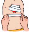 Выпавшее через рану содержимое брюшной полости (петли кишки, сальник) нельзя вправлять. Повязку накладывают прямо на них. Для этого рану закрывают любым сухим (желательно стерильным или проглаженным) материалом: марлей, салфетками, хлопчатобумажной тканью и накладывают бинтовую повязку, туры которой проводят вокруг живота через спину, снова на живот, перекрывая друг друга на 1/2 или 1/3. При отсутствии бинта повязку можно закрепить полотенцем, простыней или другим материалом, чтобы узел находился на боковой поверхности туловища.