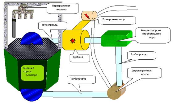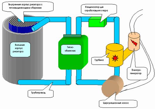 Через реактор с помощью насосов (обычно называемых циркуляционными) прокачивается теплоноситель, поступающий потом или на турбину (в РБМК) или в теплообменник (в остальных типах реакторов). Нагретый теплоноситель теплообменника поступает на турбину, где теряет часть своей энергии на выработку электричества. Из турбины теплоноситель поступает в конденсатор для пара, чтобы в реактор поступал теплоноситель с нужными для оптимальной работы параметрами. Также в реакторе имеется система управления им (на рисунке не показана), которая состоит из набора стержней диаметром в несколько сантиметров и длиной, сопоставимой с высотой активной зоны, состоящих из высокопоглощающего нейтроны материала, обычно из соединений бора. Стержни располагаются в специальных каналах и могут быть подняты или опущены в реактор. В поднятом состоянии они способствуют разгону реактора, в опущенном - заглушают его. Приводы стержней регулируются независимо друг от друга, поэтому с их помощью можно конфигурировать активность реакции в различных частях активной зоны.