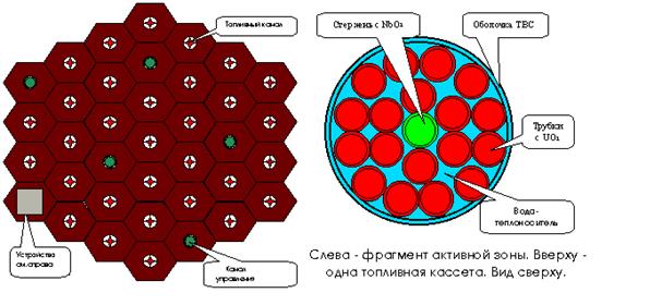 Общее число технологических каналов в активной зоне 1693. Внутри большинства технологических каналов находятся тепловыделяющие кассеты, имеющие довольно сложную структуру. Кассета состоит из двух последовательно соединенных тепловыделяющих сборок (ТВС), длина каждой из которых 3,5м. ТВС содержит 18 стержневых твэлов — трубок наружным диаметром 13,5мм с толщиной стенки 0,9 мм, заполненных таблетками диаметром 11,5мм из двуокиси урана (UO2 ), крепежные детали из сплава циркония и несущий стержень из оксида ниобия. Стенки кассеты плотно фиксированы к графитовой кладке, а внутри кассет циркулирует вода. В остальных каналах расположены стержни системы управления защитой, которые состоят из поглотителя - бороциркониевого сплава. Некоторые каналы полностью изолированы от теплоносителя, и в них расположены датчики радиации.
