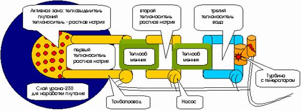 Прежде всего, в реакторе на быстрых нейтронах нет замедлителя. В связи с этим в качестве топлива используется не уран-235, а плутоний и уран-238, которые могут делится от быстрых нейтронов. Плутоний необходим для обеспечения достаточной плотности нейтронного потока, которую не может обеспечить один уран-238. Тепловыделение реактора на быстрых нейтронах в десять-пятнадцать раз превосходит тепловыделение реакторов на медленных нейтронах, в связи с чем вместо воды (которая просто не справится с таким объемом энергии для передачи) используется расплав натрия (его температура на входе - 370 градусов, а на выходе - 550, что в десять раз выше аналогичных показателей, скажем, для ВВЭР - там температура воды на входе - 270 градусов, а на выходе - 293). Опять-таки в связи с большим тепловыделением приходится оборудовать даже не два, а три контура (объем теплоносителя на каждом последующем, естественно, больше), причем во втором контуре используется опять-таки натрий. При работе такого реактора происходит очень интенсивное выделение нейтронов, которые поглощаются слоем урана-238, расположенного вокруг активной зоны. При этом этот уран превращается в плутоний-239, который, в свою очередь, может использоваться в реакторе как делящийся элемент. Плутоний используется также в военных целях.