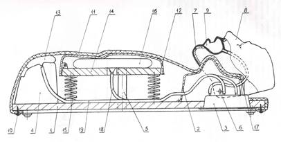 9 – полость рта, 10 – шурупы, 11 – оболочка туловища, 12 - имитатор грудной клетки, 13 – имитатор желудка, 14 – основание, 15 - упругие элементы, 16 – имитатор легких, 17,18,19, - трубопроводы