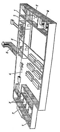 1 – защитно-герметические двери; 2 – шлюзовые камеры; 3 –санитарный узел; 4 – помещение для отдыха людей; 5 – аварийный выход; 6 – фильтровентиляционная камера; 7 – медпункт; 8 – кладовая для продуктов