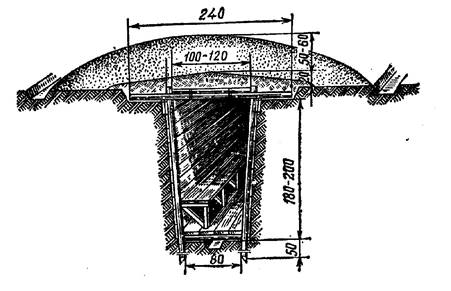 Простейшее укрытие - это открытая щель (рисунок 9), которую отрывают глубиной 180 - 200 см, шириной по верху 100 - 120 см, и по дну - 80 см с входом под углом 900 к продольной оси ее. Длина щели определяется из расчета 0,5 м на одного укрываемого.