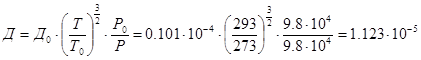 Определяем коэффициент молекулярной диффузии паров этилового спирта в воздухе при заданных условиях: Д0 = 0,101 × 10-4 при Т0 = 273° К и Р0 = 9,8 × 104 Па: