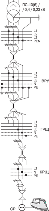 Рассмотрим характерную схему электроснабжения жилого здания (рис. 1). Источник питания – это, как правило, отдельно стоящая ПС со своим распределительным щитом 10(6)/0,4/0,23 кВ. На вводе в здание расположено вводнораспределительное устройство – ВРУ0,4/0,23 кВ. Следующая ступень – этажный групповой распределительный щиток (ГРЩ), последняя ступень – квартирный распределительный щиток (КРЩ). Упомянутые распредустройства связаны между собой проводниками, минимально допустимые сечения которых указаны в ПУЭ. Номинальные токи аппаратов, защищающие кабели и провода как от токов КЗ, так и от перегрузки, выбираются в соответствии c ПУЭ.