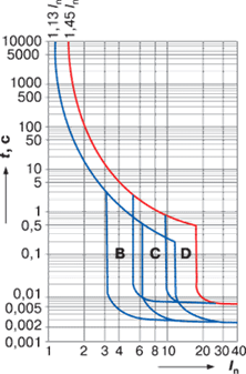 Важную роль играет время срабатывания электромагнитных расцепителей автомата при КЗ. ГОСТ Р 5034599 [3], а также аналогичные зарубежные документы, к сожалению, содержат лишь требование о том, что время действия автоматических выключателей в начальной зоне отсечки («время мгновенного расцепления») должно быть менее 0,1 с.