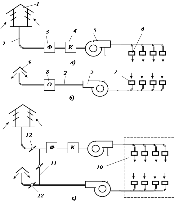Приточно-вытяжная вентиляция с рециркуляцией (рис.13,в) характерна тем, что воздух, отсасываемый из помещения 10 вытяжной системой, частично повторно подают в это помещение через приточную систему, соединенную с вытяжной системой воздуховодом 11. Регулировка количества свежего, вторичного и выбрасываемого воздуха производится клапанами 12. В результате использования такой системы достигается экономия расходуемой теплоты на нагрев воздуха в холодное время года и на его очистку.