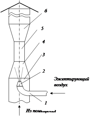 Принцип действия эжектора следующий (рис.14). Воздух, нагнетаемый расположенным вне помещения компрессором, подводится по трубе 1 (рис. ) к соплу 2 и, выходя из него с большой скоростью, создает за счет эжекции разрежение в камере 3, куда подсасывается воздух из помещения. В конфузоре 4 и горловине 5 происходит перемешивание эжектируемого (из помещения) и эжектирующего воздуха. Диффузор 6 служит для преобразования динамического давления в статическое. Недостатком эжектора является низкий к.п.д, не превышающий 0,25.