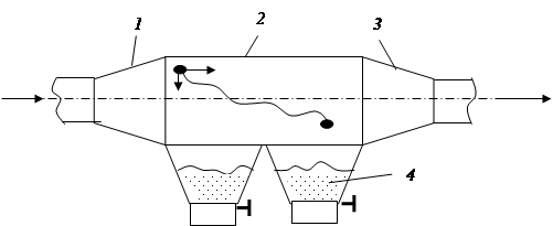 1 – входной патрубок; 2 – корпус; 3 – выходной патрубок; 4 – бункер.