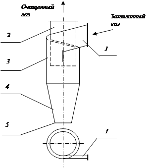 1 -входной патрубок; 2 - выхлопная труба; 3 - цилиндрическая часть; 4 - коническая часть; 5 - патрубок выхода пыли.