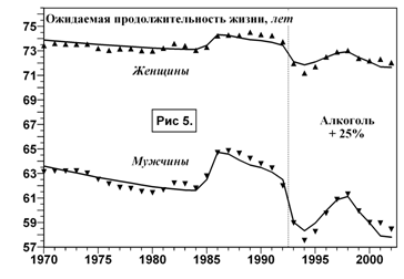 Ухудшение материального положения граждан, постоянный стресс, развал системы здравоохранения, всплеск наркомании, рост числа насильственных смертей и другие социальные завоевания последних полутора десятилетий однозначно сказались на продолжительности жизни россиян. Однако оказывается, что все эти негативные обстоятельства могут быть легко учтены, если, начиная с 1993 г., формально увеличить цифры потребления алкоголя на 25%. Между таким – эффективным – потреблением и продолжительностью жизни уже имеется прямая связь.