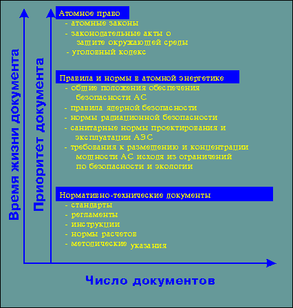 В странах с развитой атомной промышленностью, ядерной энергетикой, существует система государственного регулирования общественных отношений при использовании атомной энергии, проблем обеспечения безопасности атомных электростанций, радиационной защиты населения, защиты окружающей среды. Эта система "атомного права" постоянно совершенствуется, дополняется новыми законоположениями и нормативами. Однако смена основополагающих, принципиальных актов происходит медленно и не всегда поспевает за потребностями жизни. Кроме того в законодательстве подчас отсутствуют многие важные или принципиальные документы. Например, Атомный Закон РФ , который должен быть фундаментом атомного права под названием "Закон об использовании атомной энергии" вступил в действие лишь в ноябре 1995 г. [4]. Другой важный закон - "О защите окружающей среды" еще не стал реальным инструментом технической политики.