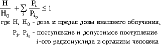 В случае одновременного воздействия нескольких радиационных факторов, поступления нескольких радионуклидов в организм в НРБ-76/87 введено условие, что сумма по всем годовым количествам поступающих в организм радионуклидов и видам радиационного воздействия, отнесенным к соответствующим предельно допустимым величинам, не должна превышать единицу , т.е. считается, что радиационная безопасность обеспечена, если